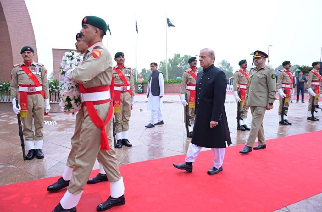 Wearing a black sherwani over a white shalwar kameez, the Prime Minister raised the national flag as the crowd stood for the national anthem, followed by patriotic songs. He then laid a wreath at the monument and offered prayers for Pakistan’s peace, prosperity, and progress.