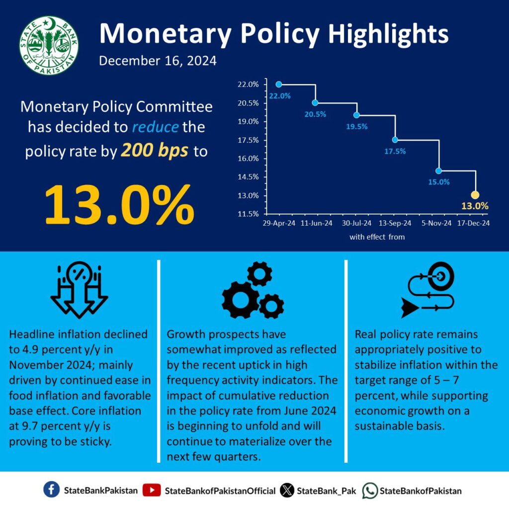 KARACHI, Dec 16, 2024: The State Bank of Pakistan (SBP) announced a significant policy rate cut of 200 basis points, reducing the rate to 13%, effective December 17, 2024. The Monetary Policy Committee (MPC) made this decision during its meeting, citing a decline in headline inflation to 4.9% year-on-year in November 2024.