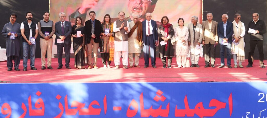 The announcement ceremony drew thousands of Arts Council members and attendees from diverse sectors, including the Karachi Chamber of Commerce, press clubs, legal associations, and cultural organizations. A unified declaration of support was made for the Ahmed Shah-Ejaz Farooqi panel.