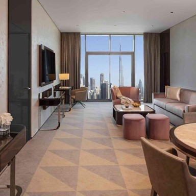 - Stylish interiors and poolside views of Burj Khalifa