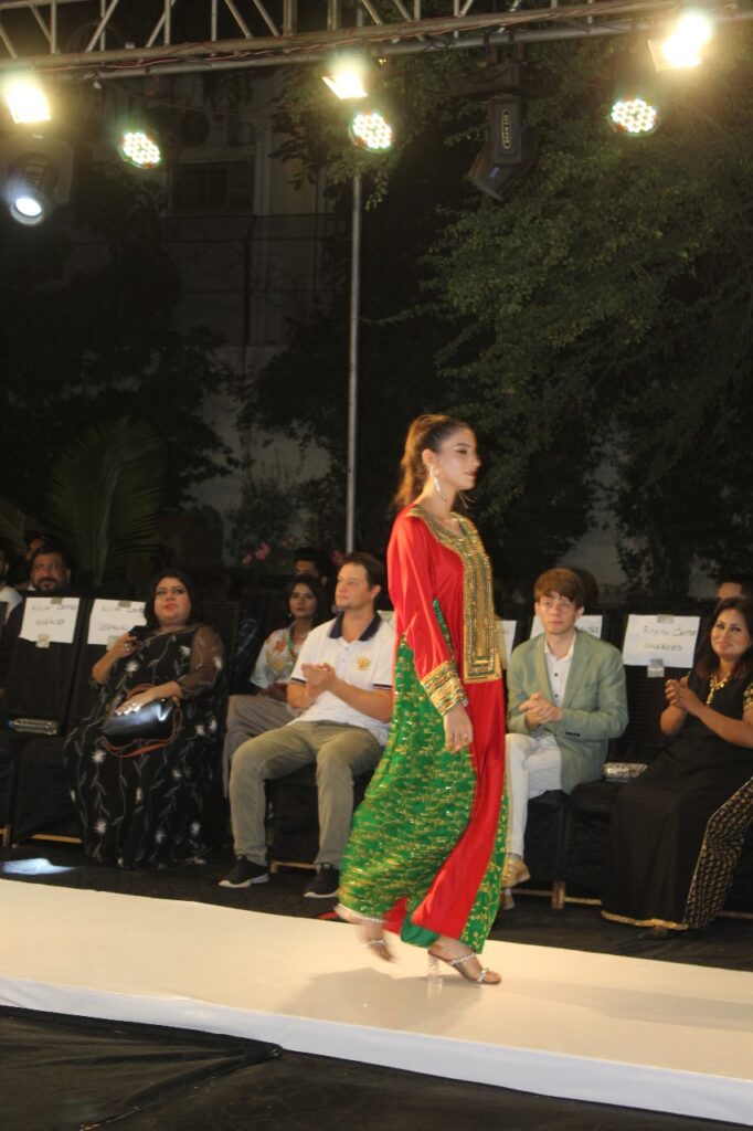 Seema Shah, an emerging women’s wear designer, showcased intricate chikankari and Multani hand embroidery in vibrant colors. Her collection featured stark white chikankari kameezes paired with Multani embroidered shalwars and light chiffon dupattas. The inclusion of Lahore-based trans-model Afreen added a unique touch to the presentation.