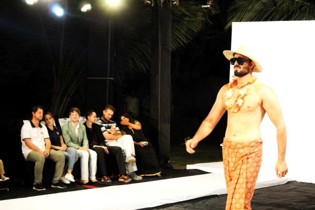The event featured collections from designers based in Karachi, Lahore, Islamabad, and even Oman. The show opened with Zubair Shah’s “Tropical Paradise,” a resort-wear collection characterized by colorful sarongs, airy cotton tops, neon pants, and striped casual jackets. Accessories included sun hats, chunky jewelry, seashell-encrusted flip-flops, and floral garlands. Social media influencer Arshan Ali and TV star Sarah Omair were among the standout models in this segment.