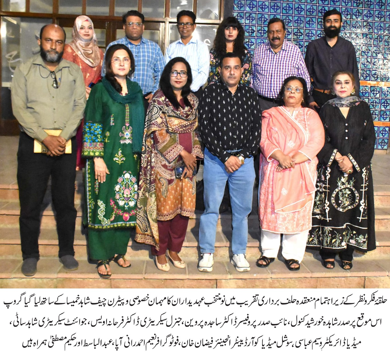 Chief Guest and Chief Patron Shahid Khameesa administered the oath to the newly elected office-bearers, including President Shahida Khurshid Kanwal, Vice President Professor Dr Sajida Parveen, General Secretary Dr Farhana Owais, Joint Secretary Shahid Satti, Finance Secretary Ruby Raza, Director Media Waseem Abbasi, and Social Media Coordinator Engineer Muhammad Faizan Khan. Members of the consultation body, Rani Apa, Abdul Basit, Hakeem Mustafa, Rizwana Shahid, Dur-e-Shahwar Nisar, Singer Huma Kanwal, and photographer Naeem Ahmed also took oath.
