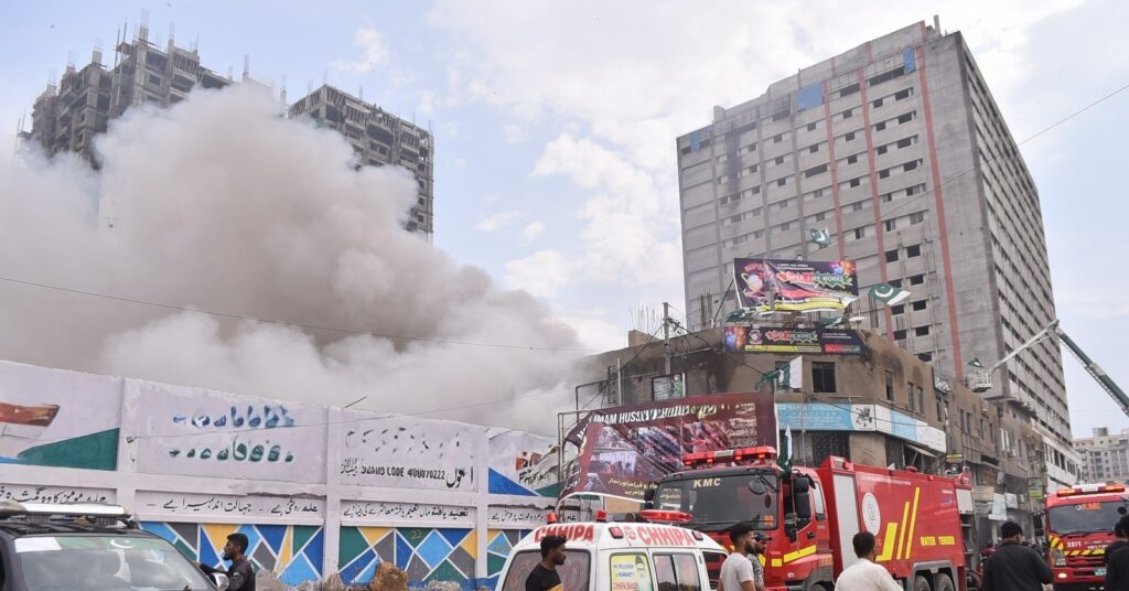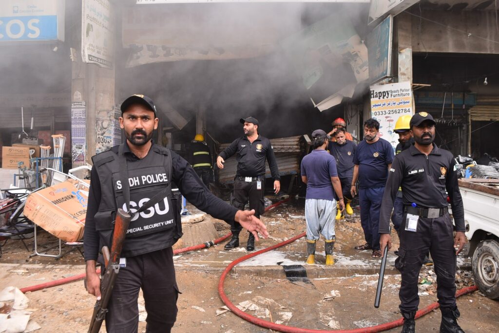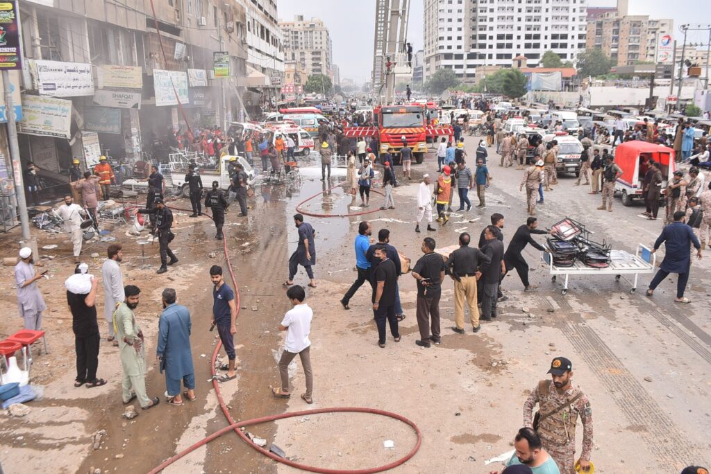 Police and Rangers quickly cordoned off the site as firefighters battled flames that engulfed the warehouse. Traffic on M.A. Jinnah Road near Sea Breeze Plaza was sealed off from both sides amid fears of further explosions. According to police surgeon Dr. Summaiya Syed Tariq, 34 injured persons were shifted to hospitals — 20 to Jinnah Hospital and 14 to Civil Hospital — with at least four of them in critical condition. One patient with severe injuries has been taken for emergency surgery. Many victims sustained burns and injuries from flying glass after the shop’s windows were blown out by the blast.