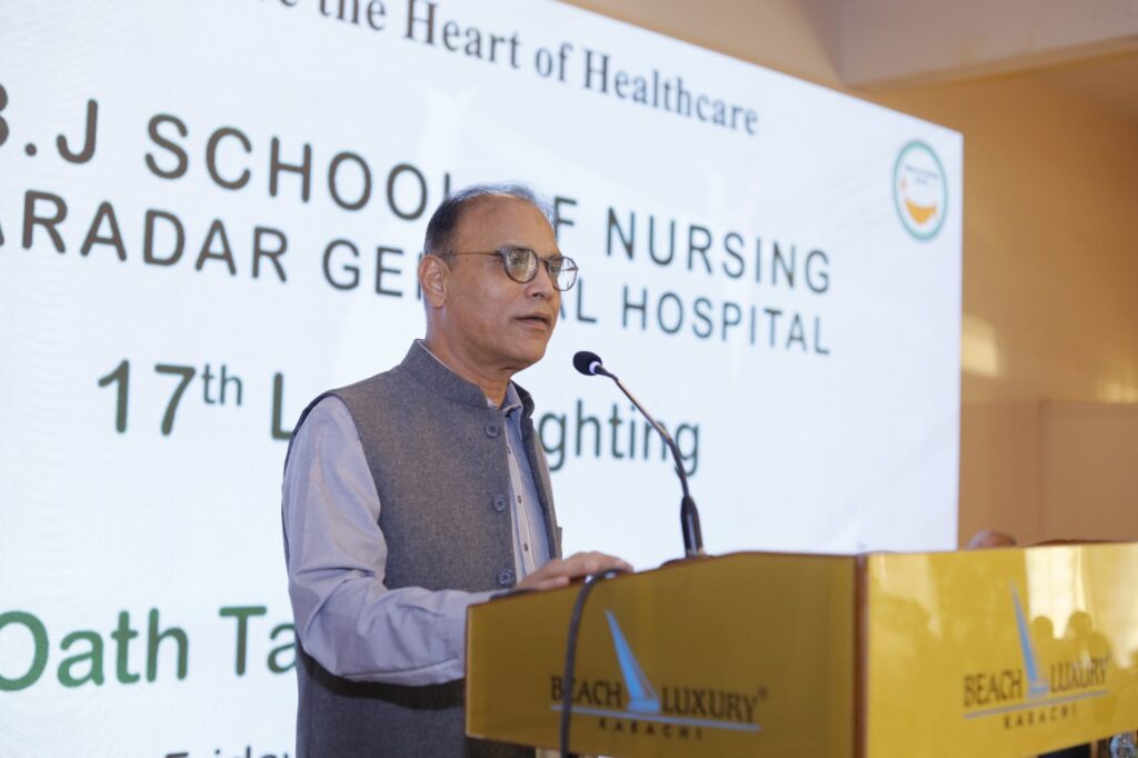 Karachi: At the 17th lamp lighting and oath-taking ceremony of Kharadar General Hospital School of Nursing, Dow University of Health Sciences Vice Chancellor Professor Muhammad Saeed Qureshi emphasized the importance of professional education for the youth. He stated that only by providing professional education can the country secure a brighter future. Furthermore, he highlighted the urgent need for millions of nurses to strengthen the health system. In this regard, the school plays a vital role by producing highly skilled nurses through quality education, teaching, and research. A professional nurse not only saves lives but also inspires hope and confidence among patients.