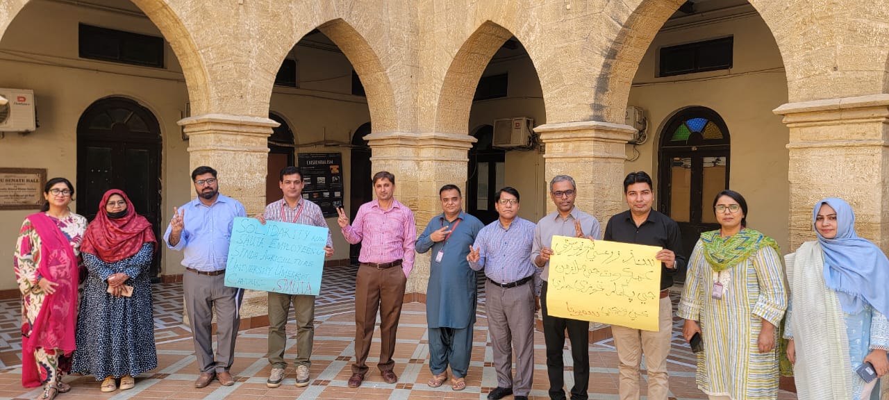 Responding to a call from the Sindh Agriculture University Teachers Association (SAUTA), SMUTA members wore black armbands and held placards at the SMIU campus to protest the delay in salary disbursements and to urge authorities to ensure immediate payment to the affected employees.