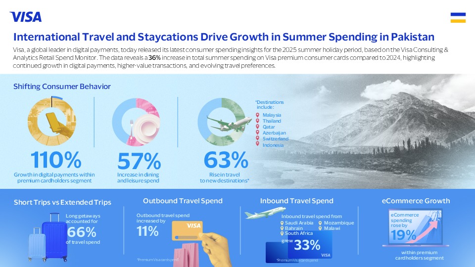 Karachi: Visa, a global leader in digital payments, today released its latest consumer spending insights for the 2025 summer holiday period in Pakistan, based on the Visa Consulting & Analytics (VCA) Retail Spend Monitor. The data shows a 36% increase in total summer spending on Visa premium consumer cards compared to 2024, underscoring the rapid growth of digital payments, higher-value transactions, and evolving travel preferences.
